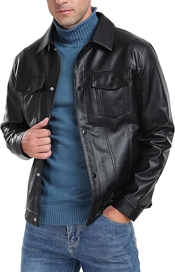 Men's Leather Jacket Lapel Collar Motorcycle Coat Snap Button Faux Leather Bomber Jackets