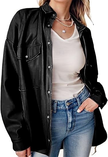 Women's PU Leather Jacket Shacket Button Down Lapel Blazer Coat with Bust Pocket